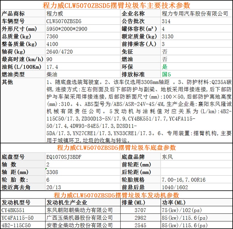 采用東風原裝底盤,EQ1070SJ3BDF 國五 多利卡D6,脂玉白,軸距3308,1730單排前翻轉(zhuǎn)駕駛室,發(fā)動機國五朝柴 CY4BK551,102馬力;全柴4B2-115C50,115馬力,變速箱5A100(5TS40)萬里揚5擋變速箱,前后橋1.8/3.5T,車架190mm,板簧6/6+5,輪胎7.00R16鋼絲胎,動轉(zhuǎn)、方向助力、氣剎、ABS、空調(diào)。