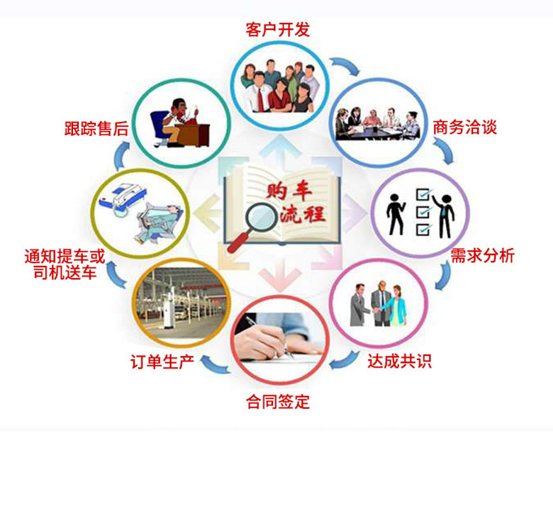 2、購車流程: | 1、咨詢洽談(電話洽談或來廠考察洽談) 2、簽訂汽車購銷合同(傳真、郵遞或者來廠簽訂) 3、我廠按時按質(zhì)生產(chǎn) 4、交付驗收 >>點擊查看詳細內(nèi)容 |