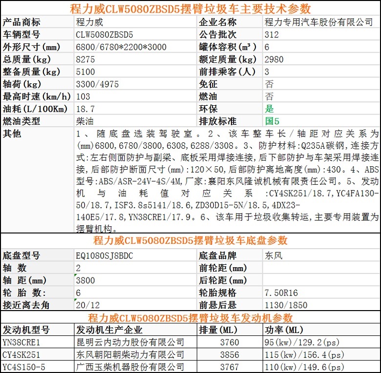 采用東風(fēng)原裝底盤,EQ1110SJ8BDC 國五 多利卡D7,脂玉白,軸距3800,2030單排前翻轉(zhuǎn)駕駛室,發(fā)動(dòng)機(jī)國五朝柴 CY4SK251,156馬力;一汽錫柴4DX23-140E5,140馬力,變速箱6A120(6TS55)萬里揚(yáng)6擋變速箱,前后橋2.2/4.2T(2.5/5.5T配8.25R16),192mm寬的變截式大梁,板簧8/10+7,輪胎8.25R16鋼絲胎、方向助力、斷氣剎、電動(dòng)車窗、中控鎖、ABS、帶原廠空調(diào)。