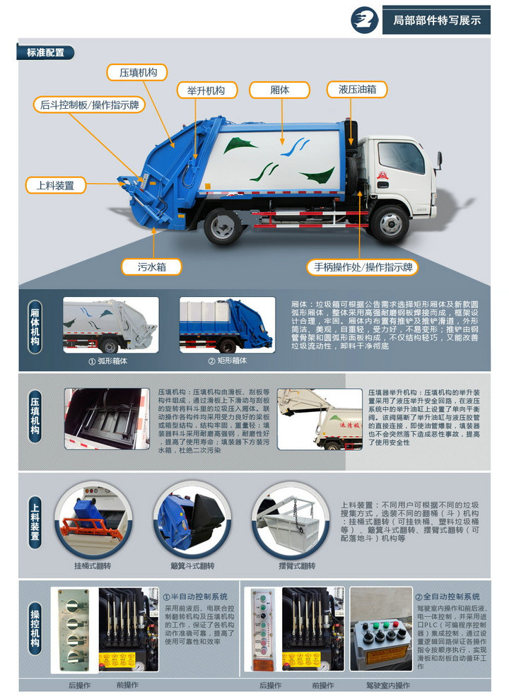 壓縮式垃圾車由密封式垃圾廂、液壓系統(tǒng)、操作系統(tǒng)組成。整車為全密封型,自行壓縮、自行傾倒、壓縮過程中的污水全部進入污水廂,解決了垃圾運輸過程中二次污染的問題,避免了給人們帶來不便,關(guān)鍵部件采用進口部件,具有壓力大、密封性好、操作方便、安全等優(yōu)點。