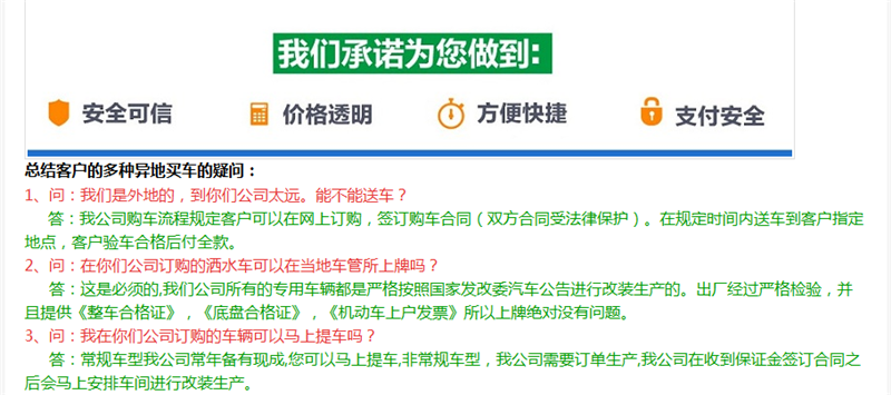 1、服務(wù)承諾: | 產(chǎn)品銷售后一年或2.5萬公里免費(fèi)維修,超過 一年,只收取配件費(fèi)。我們承諾公司對產(chǎn)品負(fù)責(zé);服務(wù)讓顧客滿意。詳細(xì)請見>> |