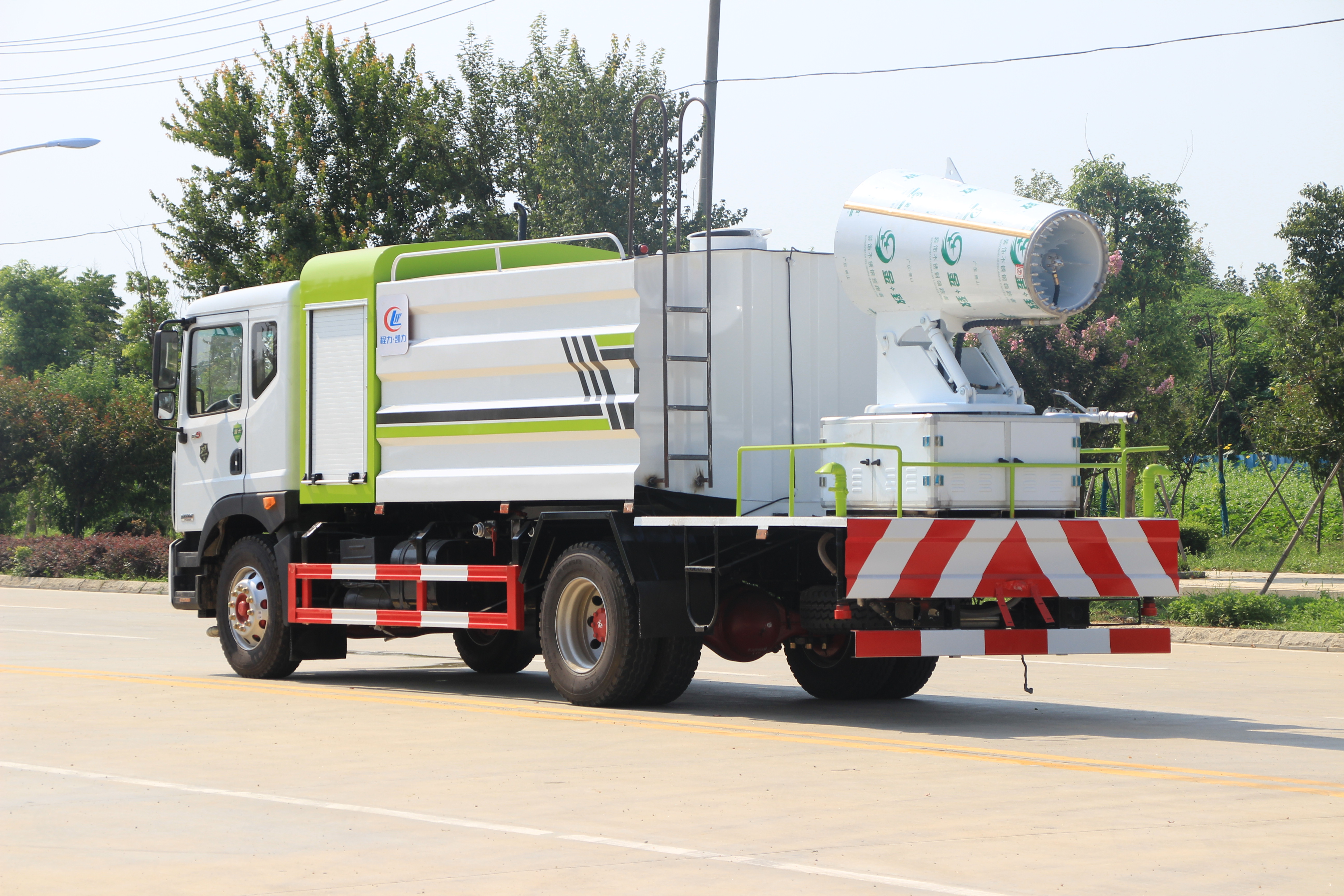 噴霧降塵車,抑塵效果約為普通灑水車的30倍,一臺噴霧降塵車的工作直徑可覆蓋4個標準足球場。水箱中的水經過霧化后,由高壓風機噴出,水霧顆粒極為細小,達到了微米級,其吸附力也增加了3倍,耗水量卻降低了70%,遭遇霧霾天氣、空氣質量PM2.5嚴重超標時,進行液霧降塵、可分解淡化空氣中的顆粒濃度、將飄浮在空氣中的污染顆粒物、塵埃等迅速逼降地面,達到清潔凈化空氣的效果。