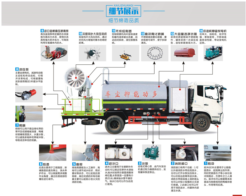 上裝配置:罐體容積為12立方灑水車,罐體鋼板為4mm碳鋼Q235材質(zhì),罐內(nèi)隔板具有防波作用,以減輕汽車行駛時(shí)罐體液體沖擊,罐體及整車外形尺寸按照公告。帶大功率專用灑水泵,泵可自吸自排,整車前沖、后灑、側(cè)噴、帶65消防接口,后平臺(tái)帶綠化灑水炮,灑水炮可全方位旋轉(zhuǎn),可連續(xù)調(diào)成直沖狀,大雨,小雨,毛毛雨,前封頭帶水位計(jì),后平臺(tái)主管路帶1寸澆花接口,后爬梯。平臺(tái)后部帶小安全告知牌:“隨時(shí)停車,注意安全”,帶兩根水管及陰陽(yáng)端。罐體顏色:上白/下藍(lán),銀灰/銀藍(lán),罐體兩側(cè)噴“灑水車、綠化噴灑車”字樣,貼反光標(biāo)示。灑水車可加裝前沖后灑氣動(dòng)閥駕駛室控制,可加裝霧炮機(jī)組,發(fā)電機(jī)組,噴霧降塵裝置,車頭可加裝推雪雪鏟,雪滾裝置,街道,公路除雪等.