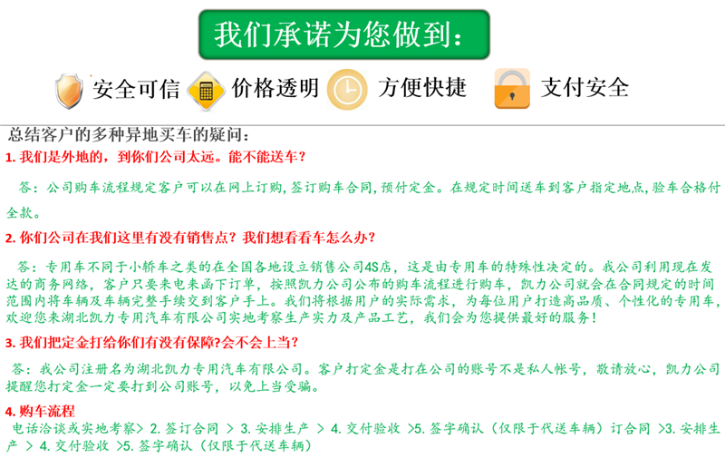 2、購車流程: | 1、咨詢洽談(電話洽談或來廠考察洽談) 2、簽訂汽車購銷合同(傳真、郵遞或者來廠簽訂) 3、我廠按時(shí)按質(zhì)生產(chǎn) 4、交付驗(yàn)收 >>點(diǎn)擊查看詳細(xì)內(nèi)容 |