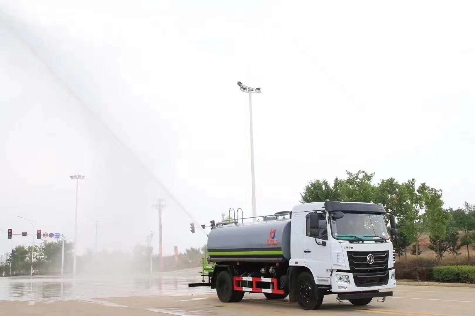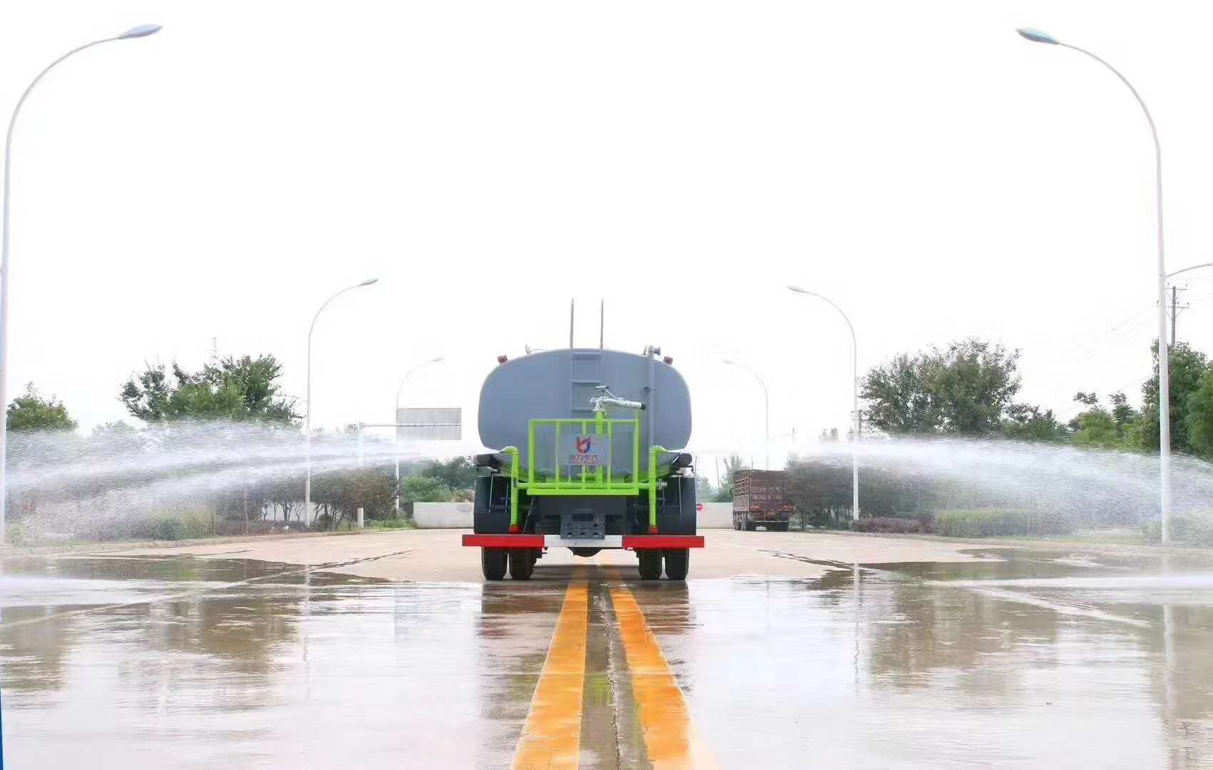 由發(fā)動機帶動變速箱,變速箱上安裝的取力器帶動灑水泵,灑水泵產生主要動力,將罐體內部的液體通過管網(wǎng)噴灑出去。自吸高度:≤7m,灑水寬度:≥20m,最大射程:≥28m;可調節(jié)成柱狀,射程≥28m;也可調節(jié)成霧狀,射程≥5m。