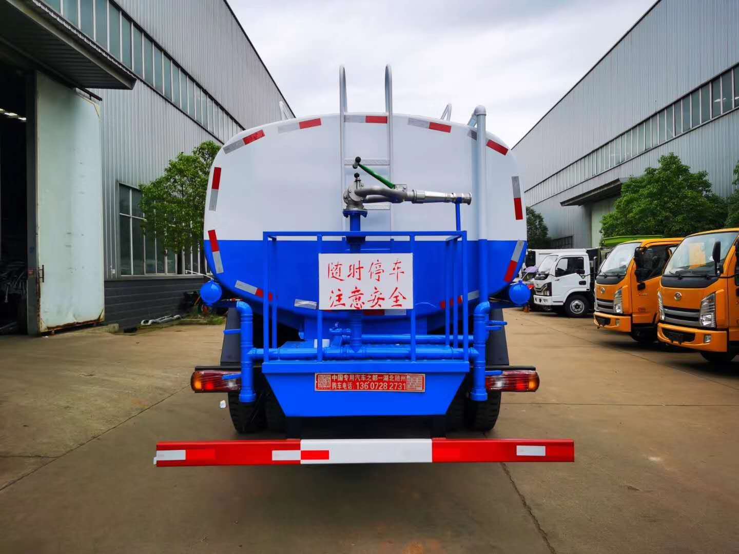 前噴后灑,前裝有鴨形噴嘴或圓頭沖嘴,后面裝有圓柱開灑水噴嘴或蓮蓬頭噴嘴,后部有一工作平臺,裝配有高壓水炮。后部還可裝8個噴嘴(選裝)噴水器一般用于沖洗街道。