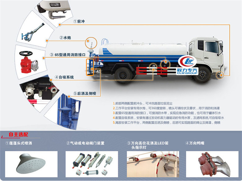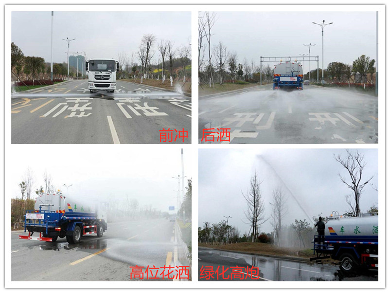 前噴后灑,前裝有鴨形噴嘴或圓頭沖嘴,后面裝有圓柱開灑水噴嘴或蓮蓬頭噴嘴,后部有一工作平臺(tái),裝配有高壓水炮。后部還可裝8個(gè)噴嘴(選裝)噴水器一般用于沖洗街道。
